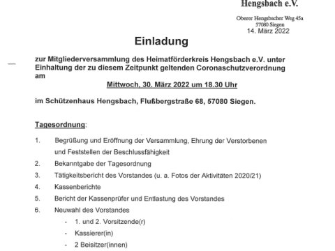 am Mittwoch, 30. März 2022 um 18.30 Uhr im Schützenhaus Hengsbach, Flußbergstraße 68, 57080 Siegen.