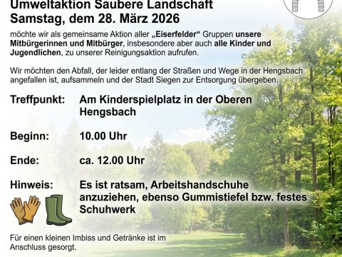 Wir laden alle Eiserfelder, Nachbarn, Kinder und Jugendlichen herzlich zu unserer großen Reinigungsaktion „Saubere Landschaft“ ein. Lasst uns gemeinsam die Straßen und Wege vom Müll befreien!